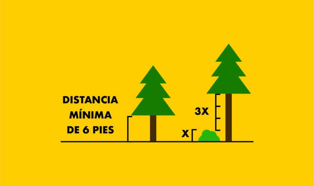 - Position trees at least 5 feet from structures, prune lower limbs, and clear away dead materials to prevent fire from climbing.